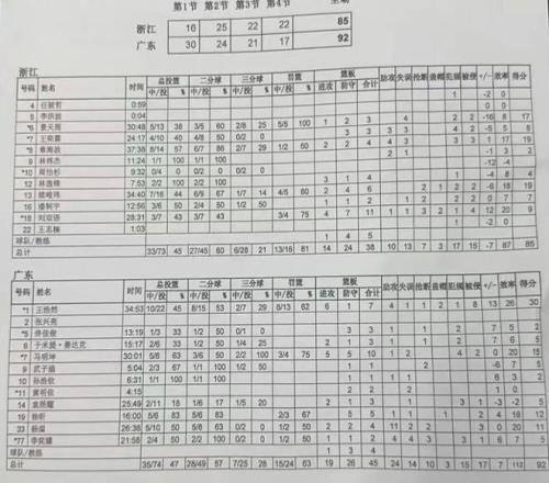 11月11日,目前全运会男篮比赛火热进行中,多场精彩对决上演。广东U22男篮迎来首场比赛,对手是浙江U22男篮。比赛开始后广东队率先进入状态,首节领先14分,半场也领先13分。下半场广东队攻防下滑,不过还是稳住了,最终以92-85获胜。此役广东新星黄明依发挥非常一般,仅仅出场4分钟就被弃用,全场数据为2篮板2失误。
